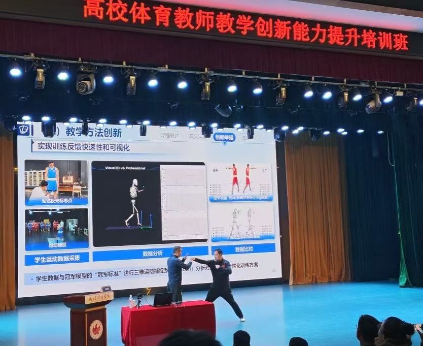 在《拳击实战应用》课程的教学创新与实践分享环节,我校姜雯耀副部长作为特邀嘉宾登台,配合完成拳击技术动作的现场演练,展现了扎实的专业素养与教学实践能力。